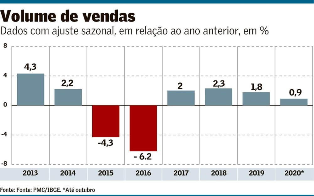 O varejo encerra 2020 registrando o mais fraco desempenho de fim de ano desde 2015 e 2016, quando a recessão fez o setor encolher cerca de 7% no Natal. Associações projetam números para dezembro abaixo do verificado em anos anteriores, reflexo do encolhimento do auxílio emergencial e de uma nova onda de fechamento de lojas e de reduções de horário de funcionamento do comércio no país. Grandes varejistas já abrem a temporada de liquidações com descontos de até 80%.